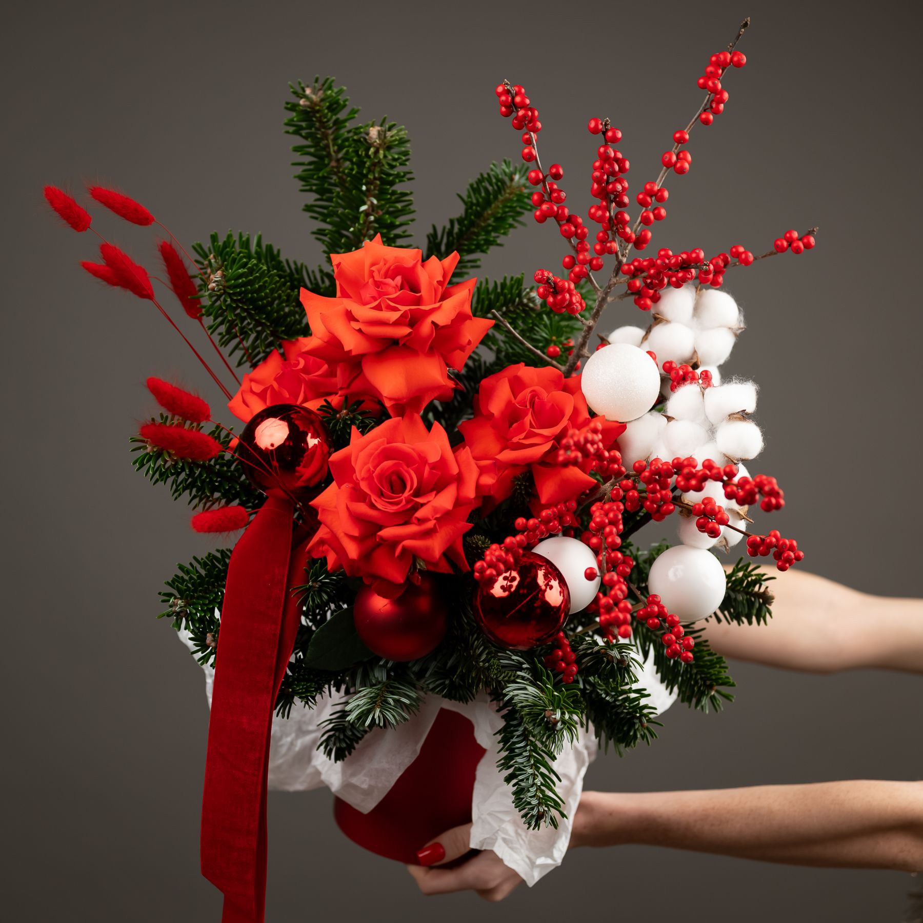 Эта композиция — сочетание благородства и природной красоты: пышные бутоны французской розы, текстура хлопка, свежий аромат нобилеса и яркие ягоды илекса создают эффектный контраст и гармонию. Роскошный зимний подарок, который подчеркнёт стиль и вкус получателя.