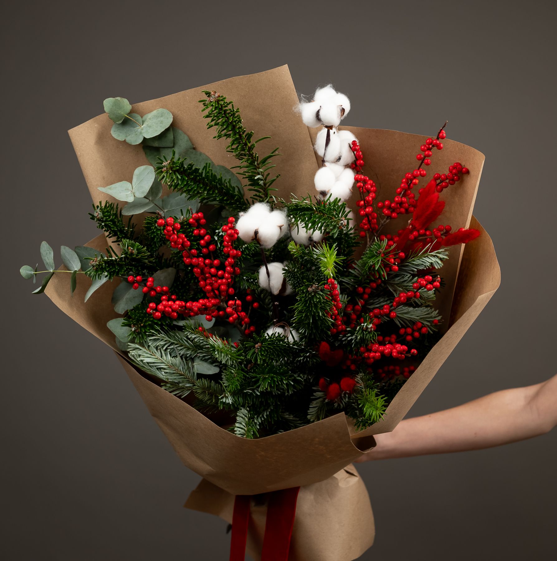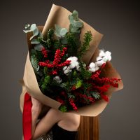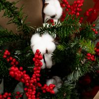 Букет из илекса, эвкалипта, хлопка и нобилиса — это гармония природной свежести и зимнего уюта. Яркие ягоды илекса добавляют выразительный акцент, эвкалипт придаёт композиции лёгкость и современность, хлопок смягчает образ своей воздушной текстурой, а нобилис наполняет букет хвойным ароматом и ощущением праздника.