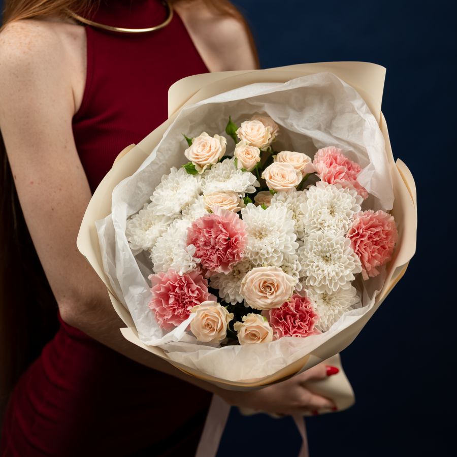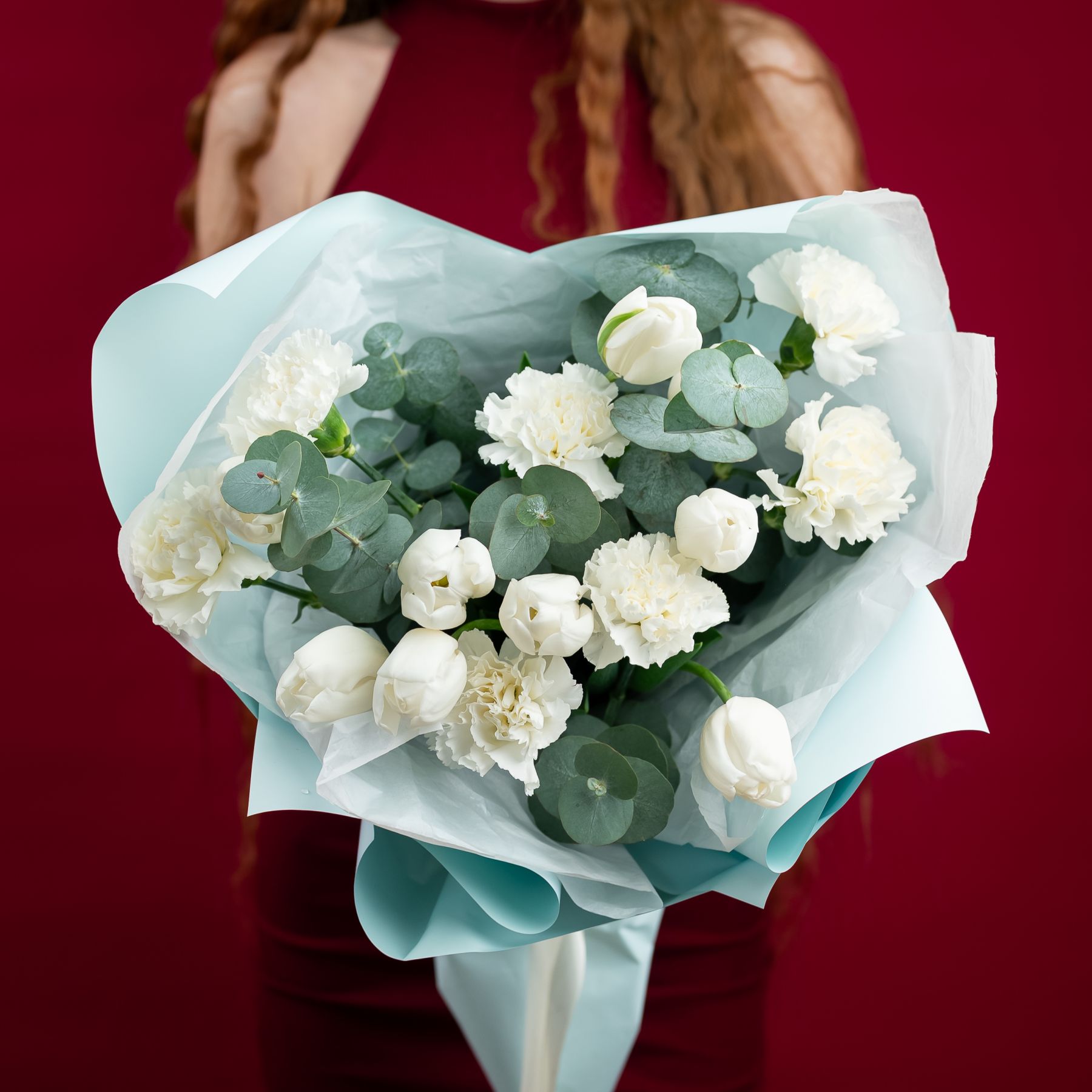 Белые тюльпаны с диантусами и эвкалиптом
