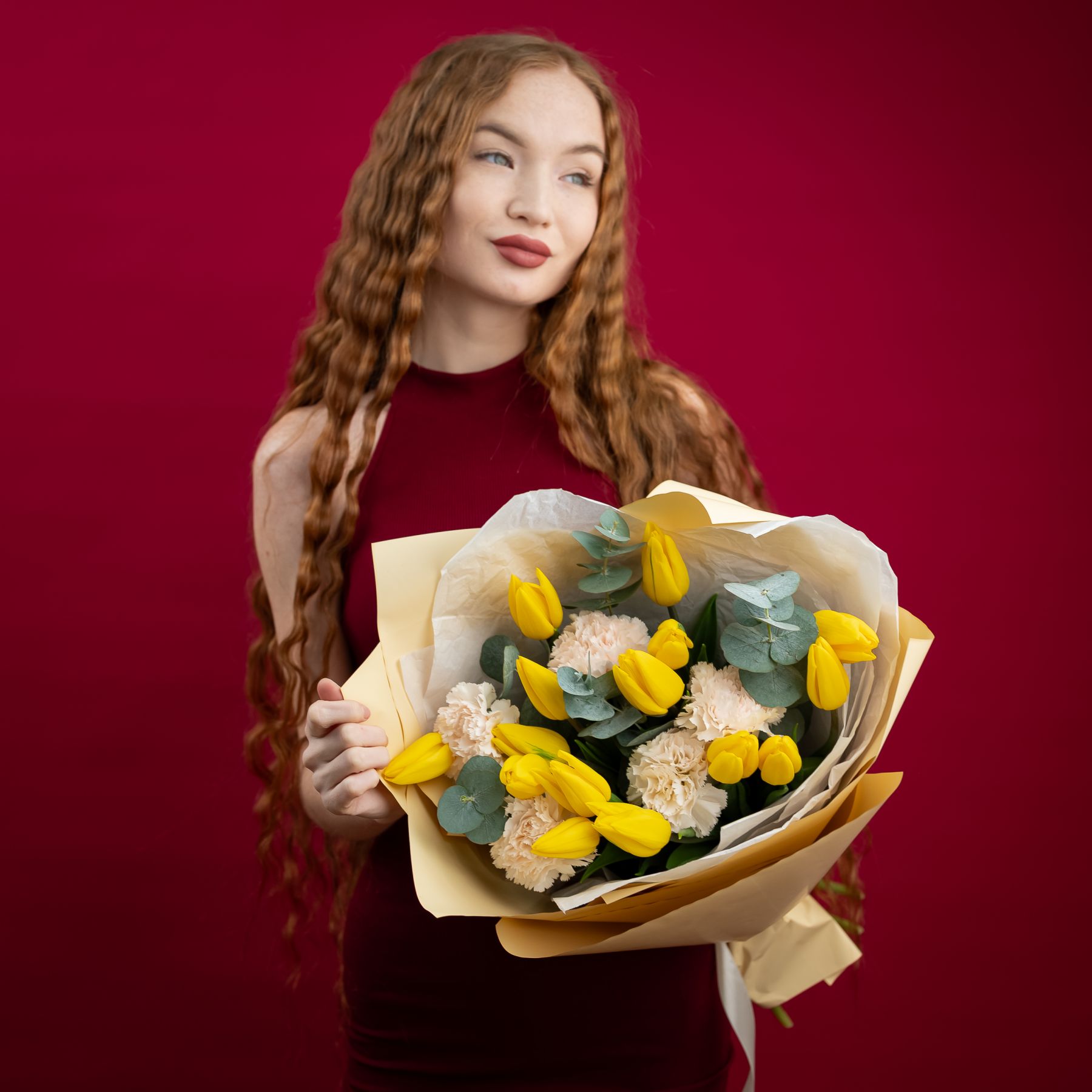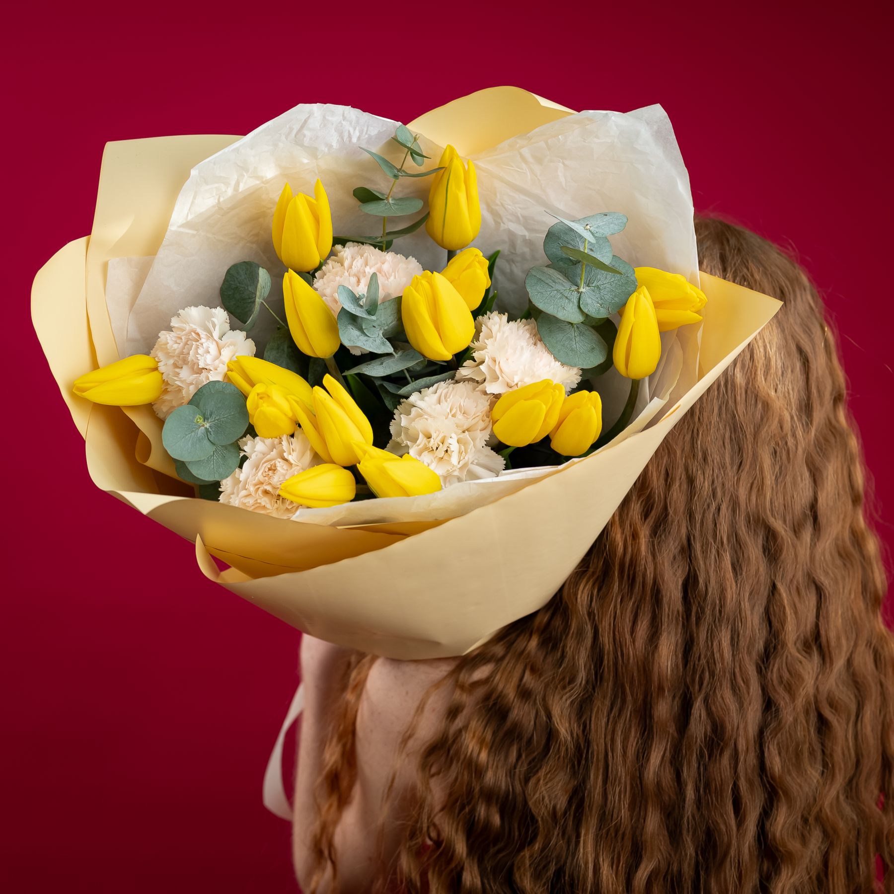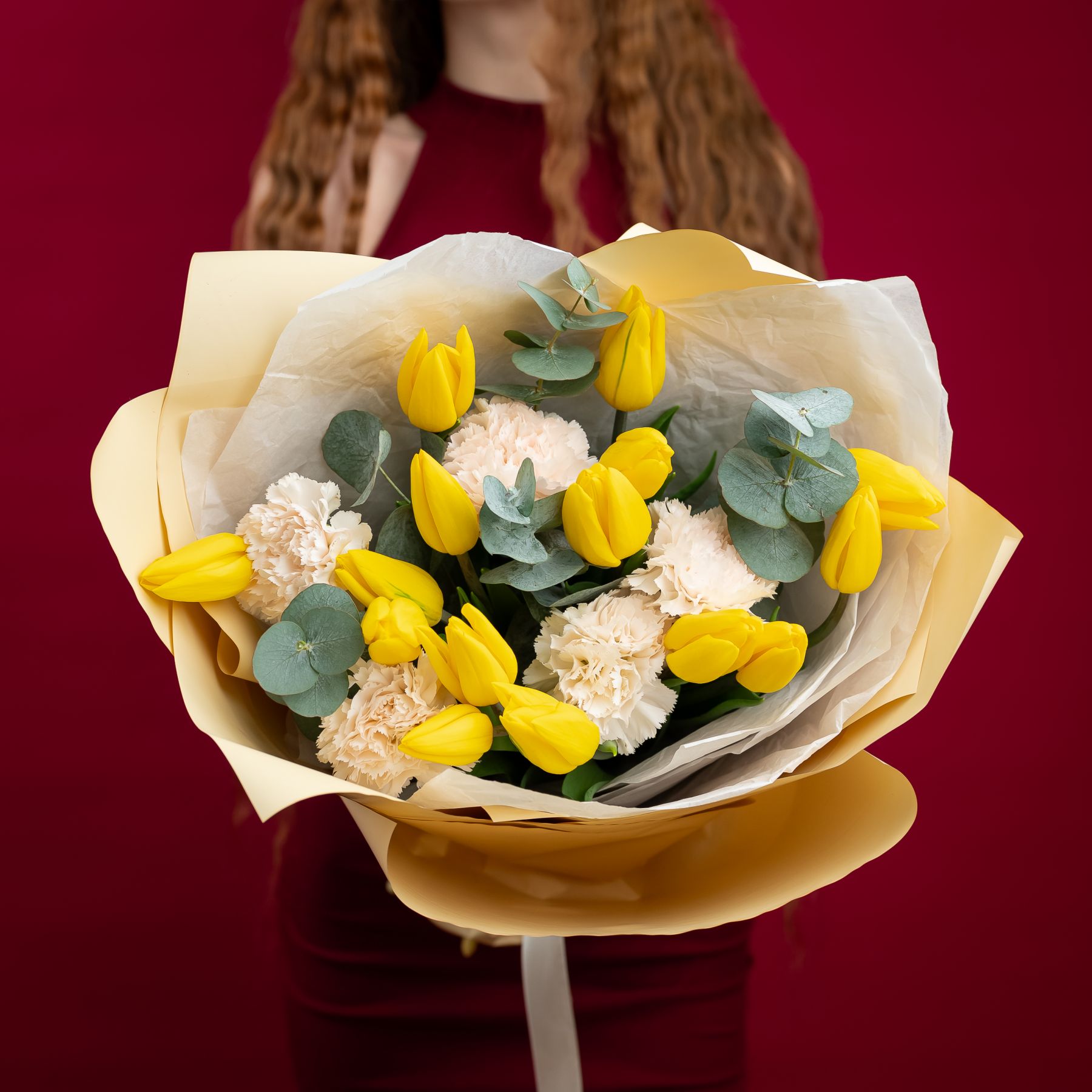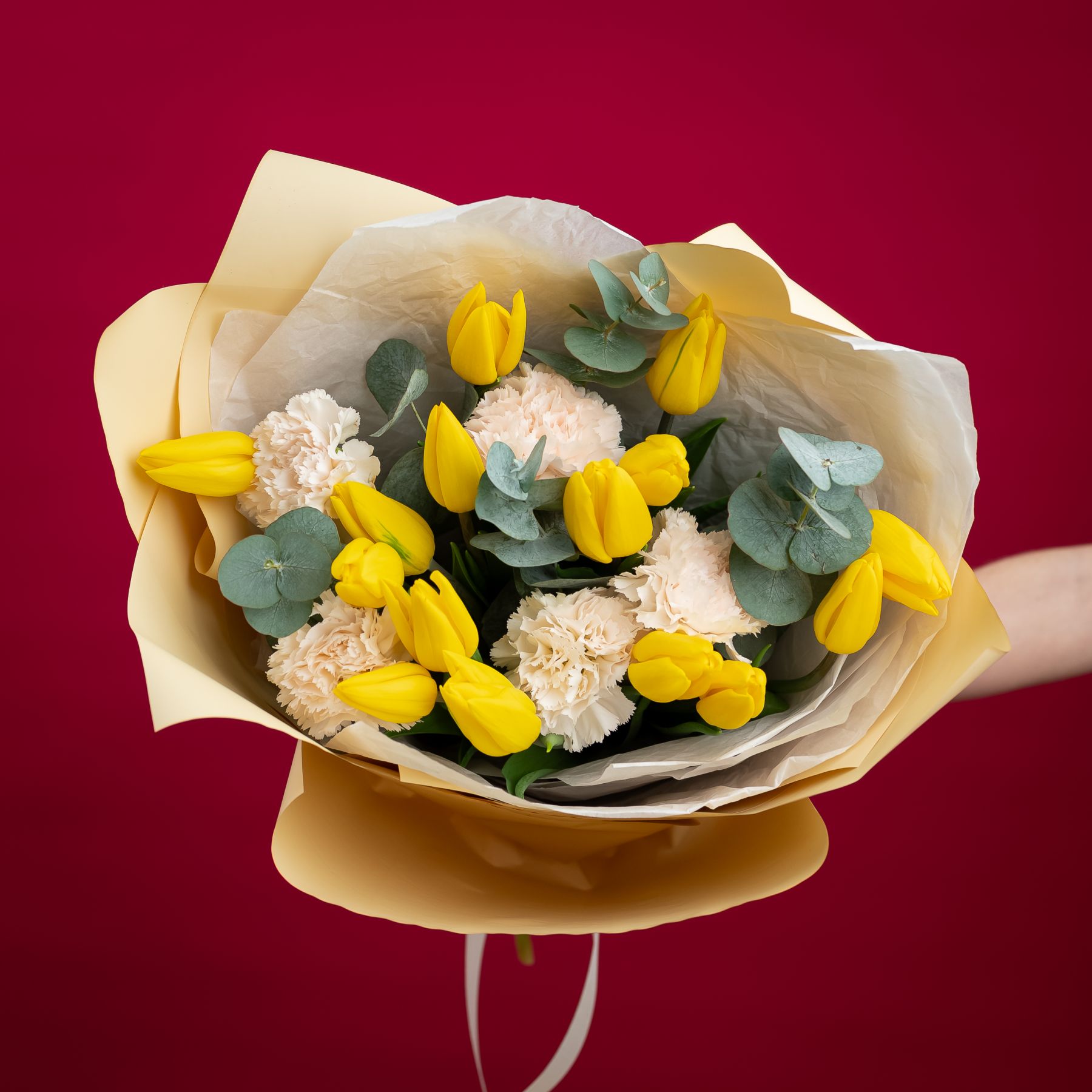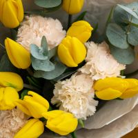 Солнечные жёлтые тюльпаны в сочетании с нежными диантусами — букет, наполненный светом, теплом и искренними эмоциями.