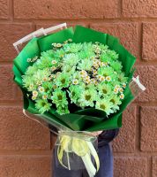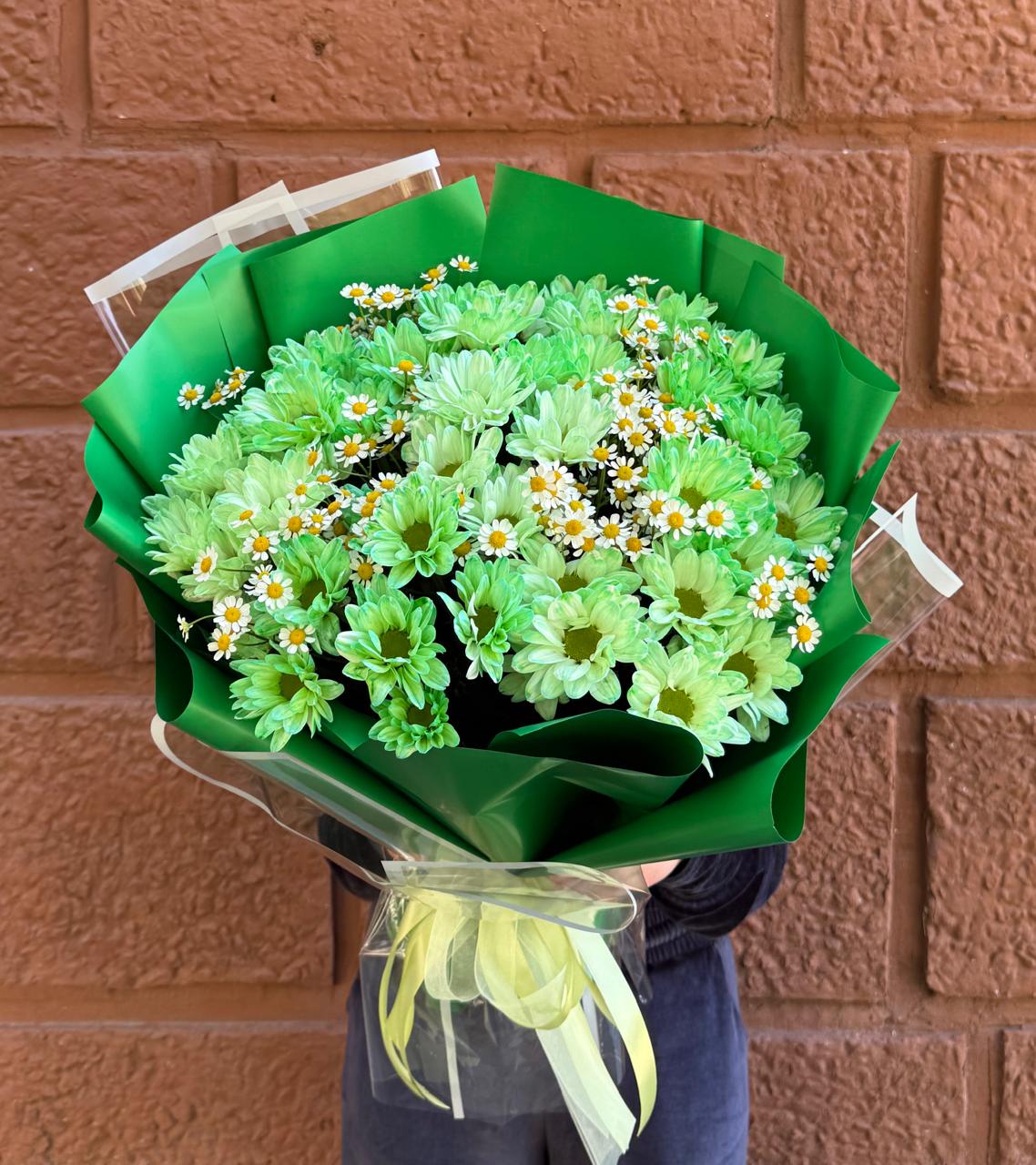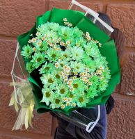 Этот букет из зелёных кустовых хризантем словно создан для того, чтобы рассказать о чувствах без слов. Их мягкий, травяной оттенок напоминает о первых тёплых днях весны, когда природа пробуждается, а сердце замирает от предвкушения любви
