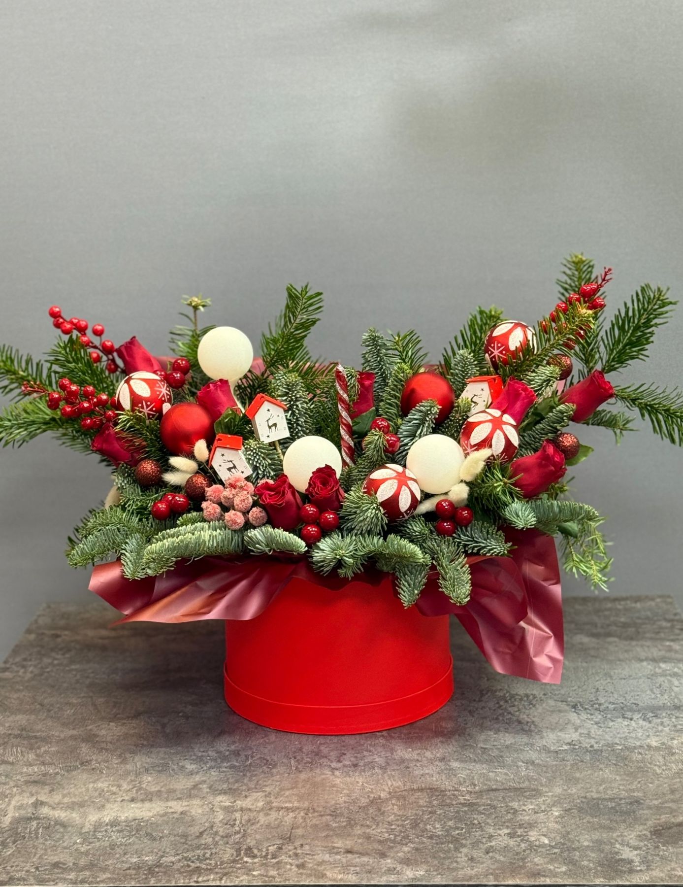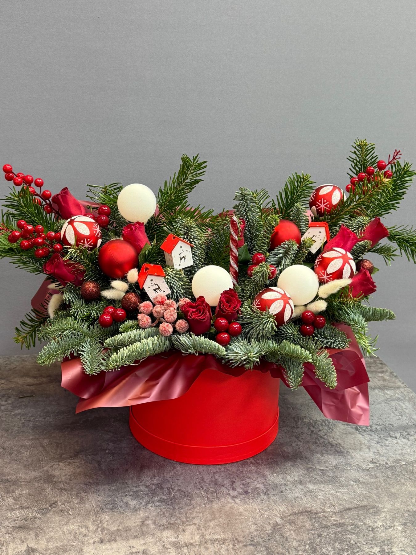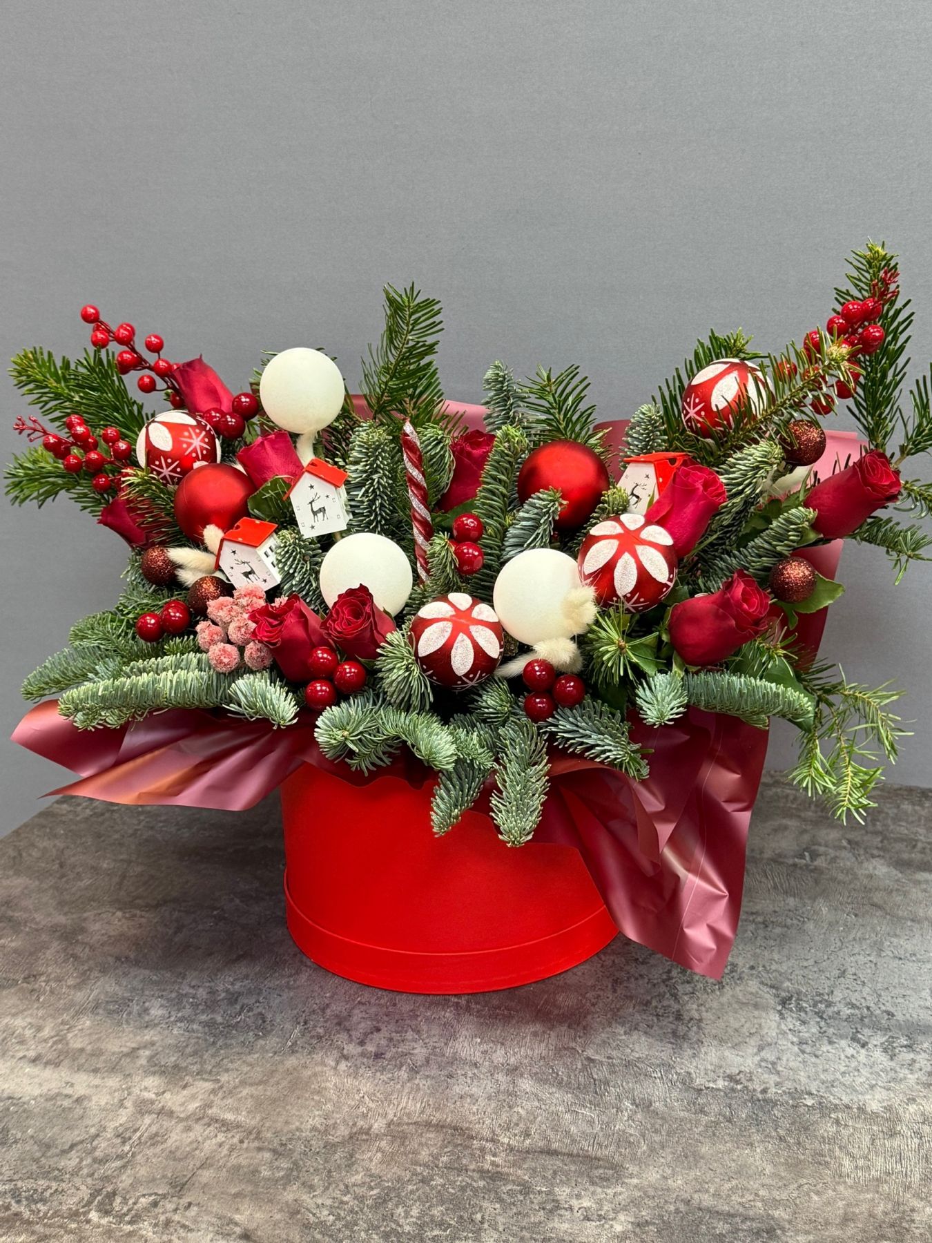 Композиция из нобилиса с красными новогодними игрушками — изящное сочетание воздушной зелени и праздничных акцентов. Нежные веточки нобилиса создают лёгкость и объём, а глубокий красный цвет игрушек добавляет тепла и новогоднего настроения. Элегантная и сдержанная, эта композиция станет стильным украшением интерьера или универсальным подарком к празднику.
