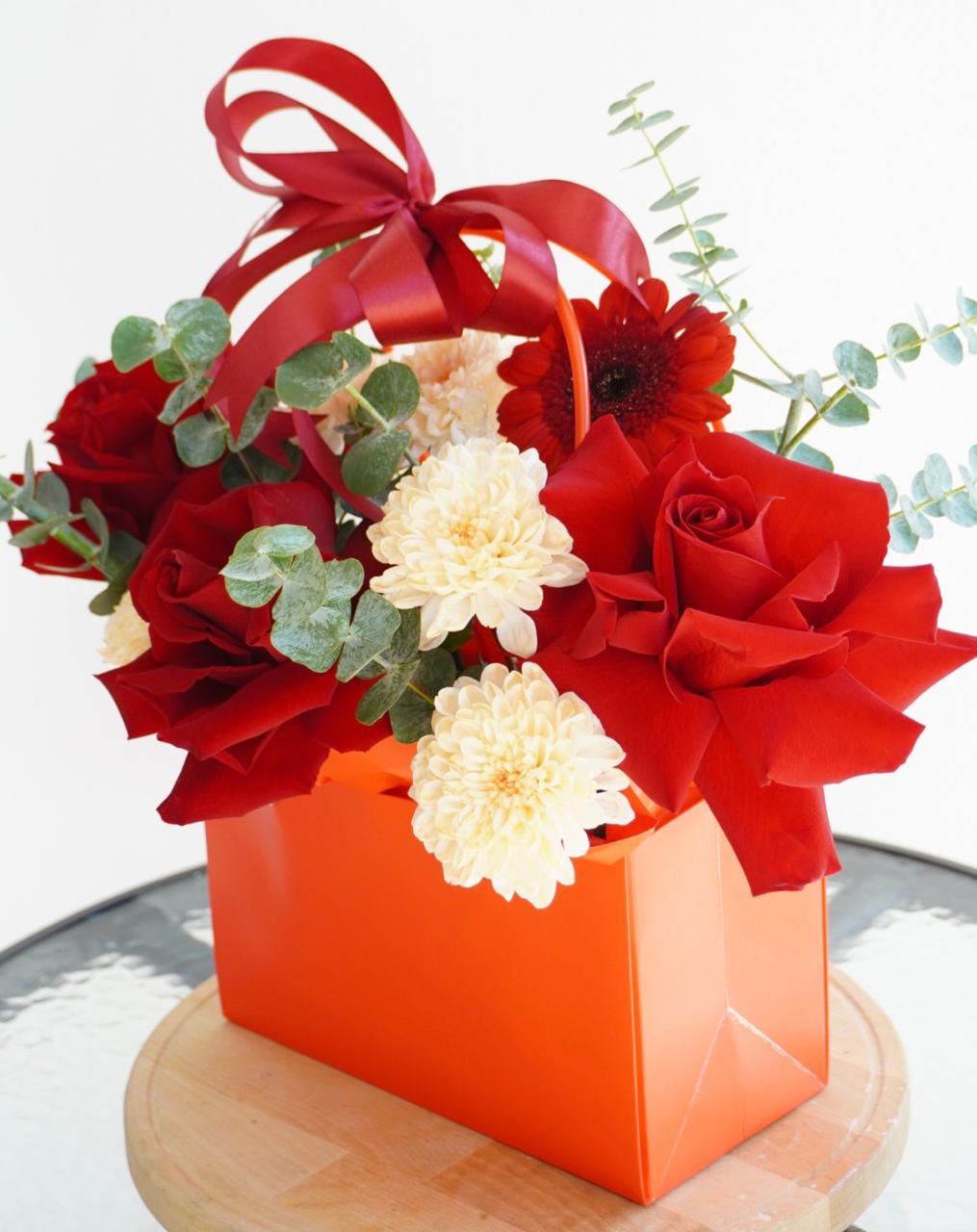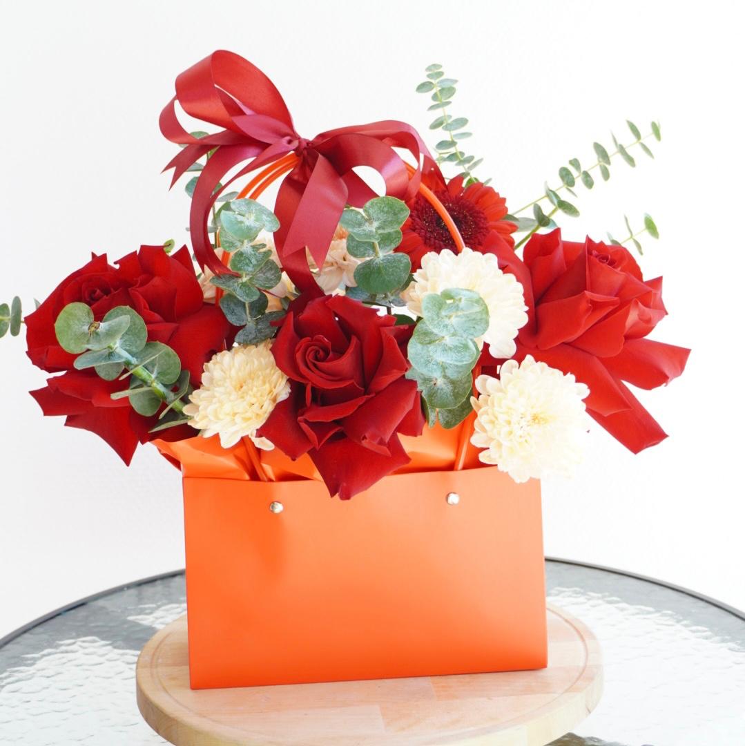 Хризантема кустовая 1 шт,эвкалипт 1 шт,гербера 1 шт,Французская роза 3 шт,сумка,губка флористическая