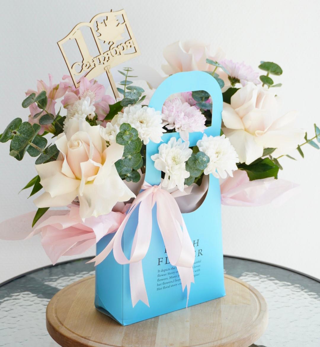 Французская роза 3 шт,хризантема кустовая 1 шт ,альстромерия 1 шт,топпер,сумка,губка флористическая