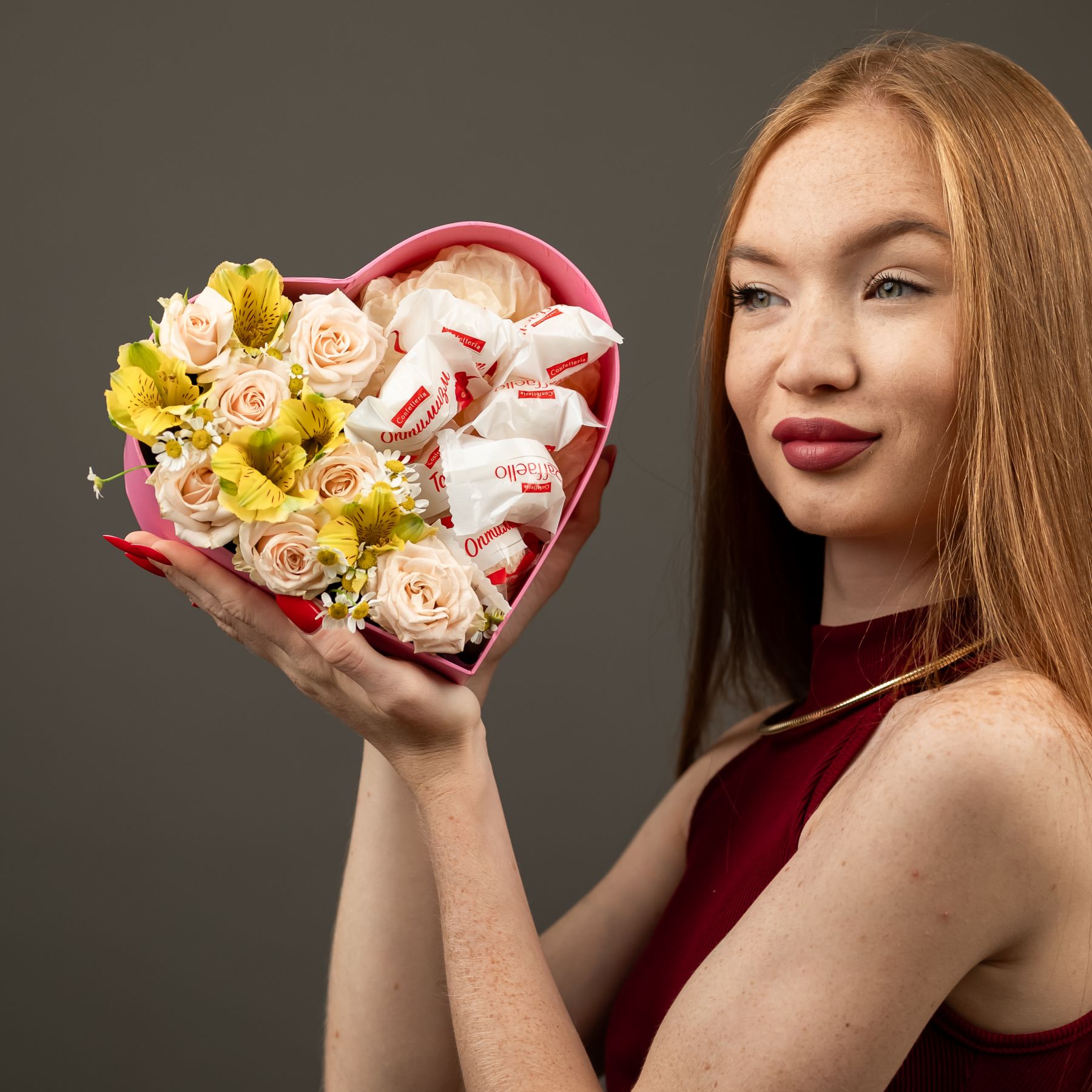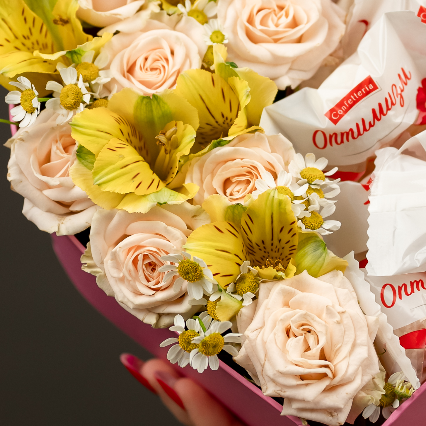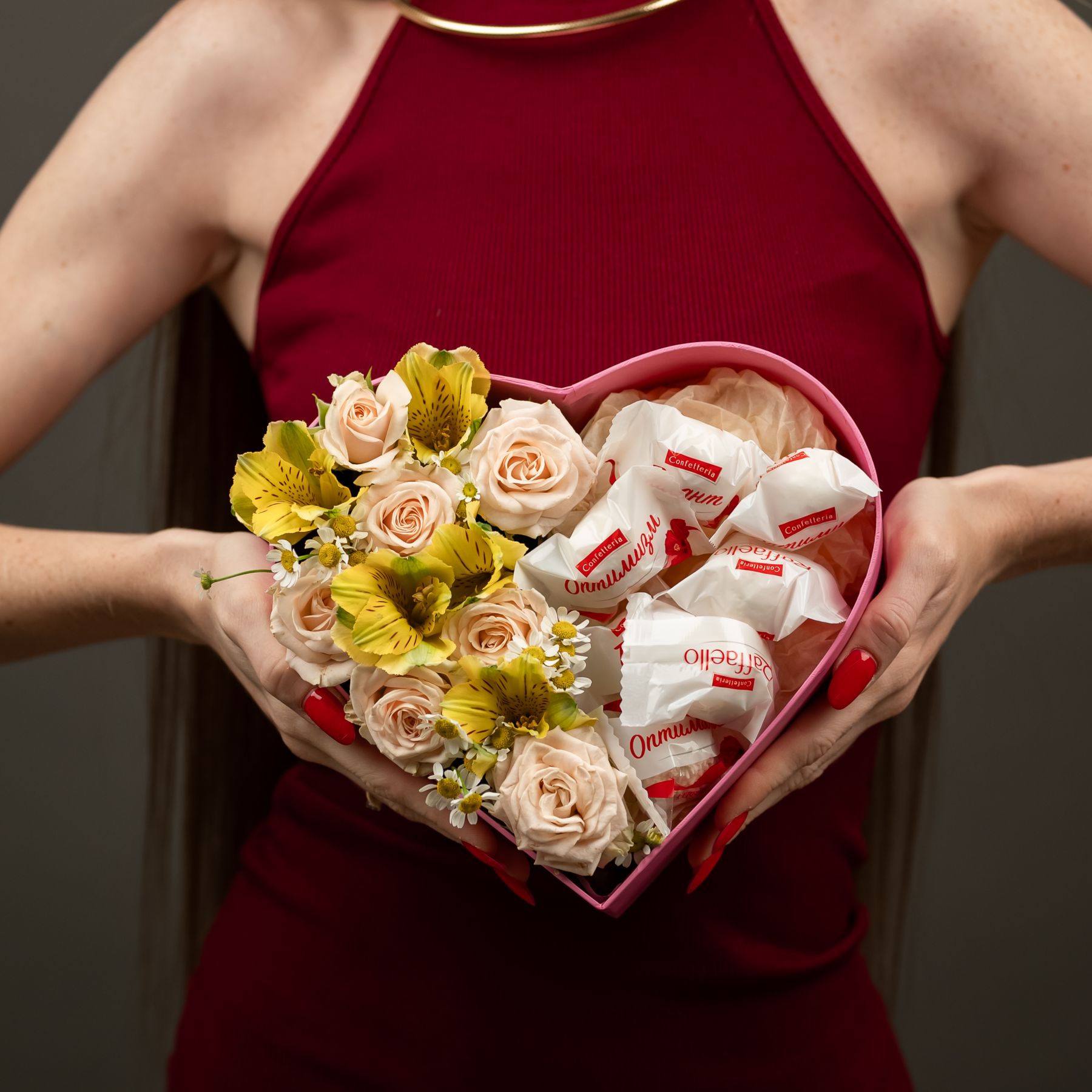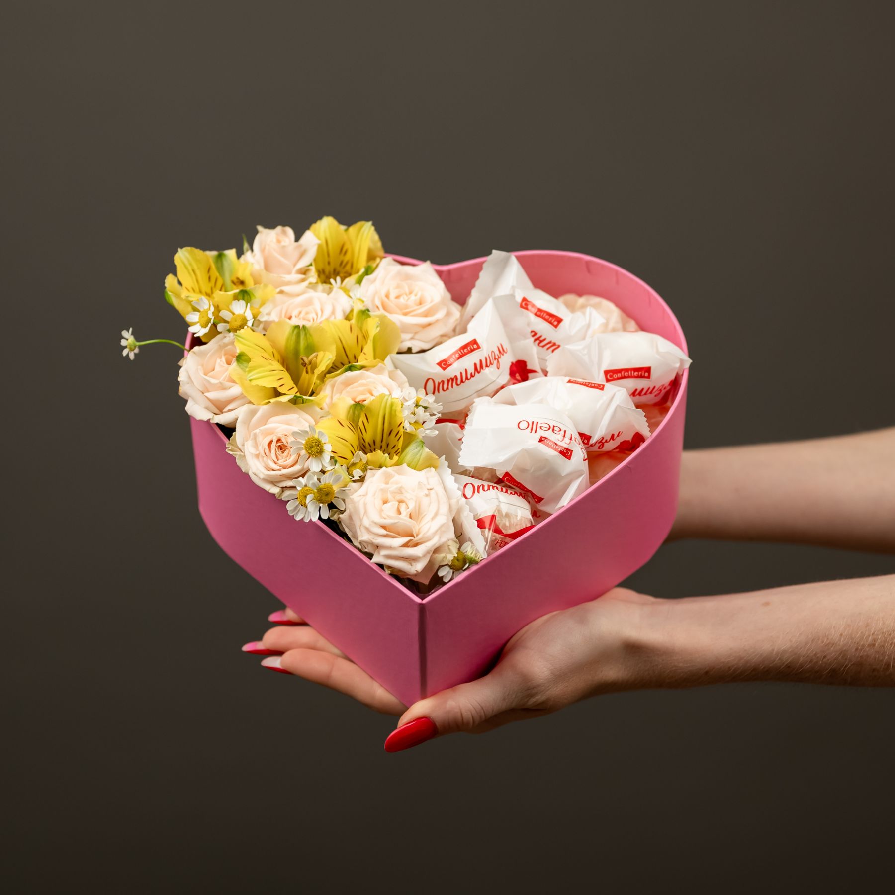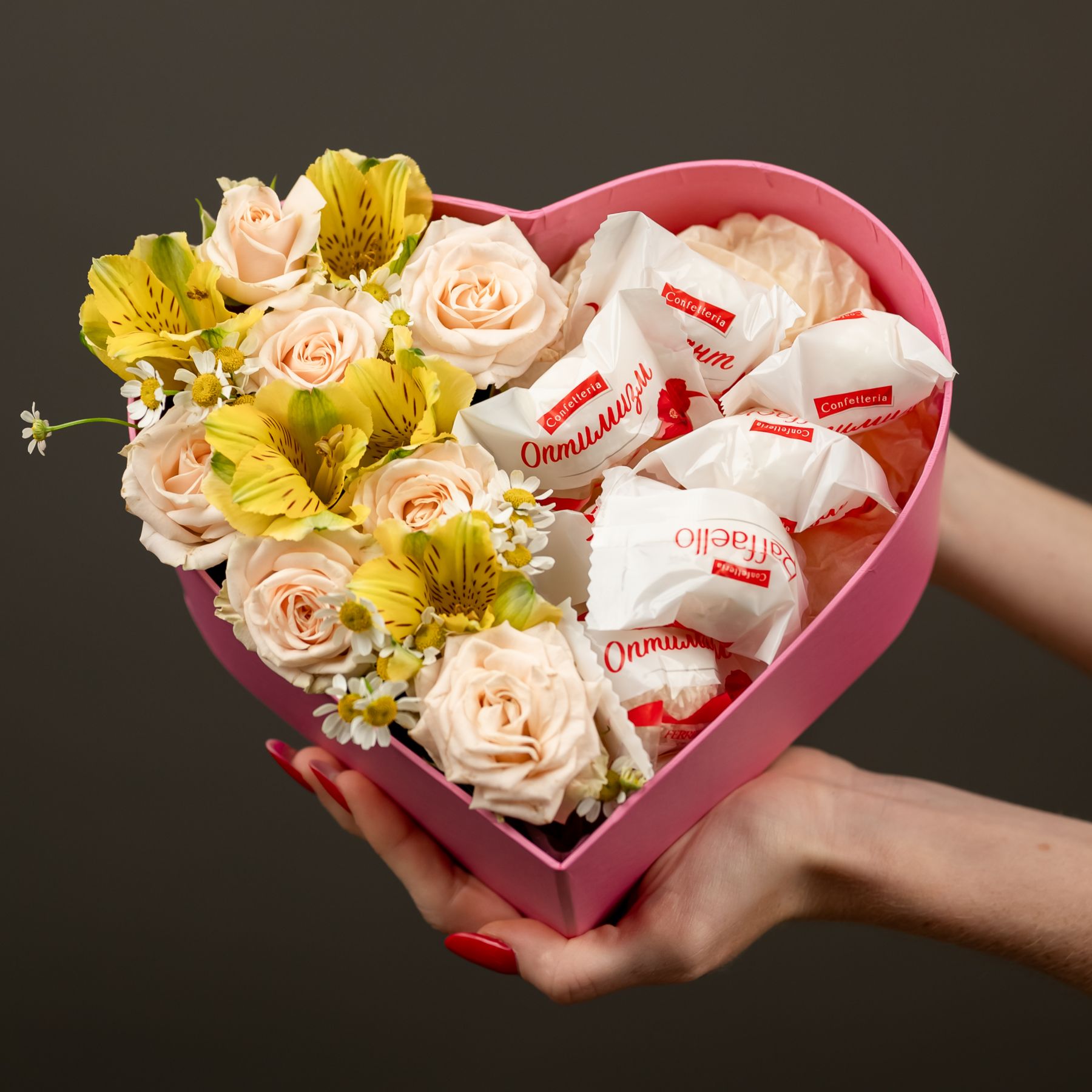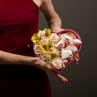 Композиция в коробке сердце с розами и конфетами