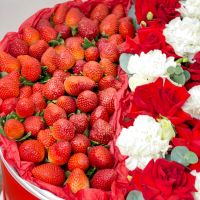Композиция выполнена в форме сердца и объединяет свежую ароматную клубнику и роскошные красные розы с нежными белыми цветами. Такой подарок идеально подойдёт для признания в любви, романтического сюрприза или поздравления любимой девушки в День святого Валентина.